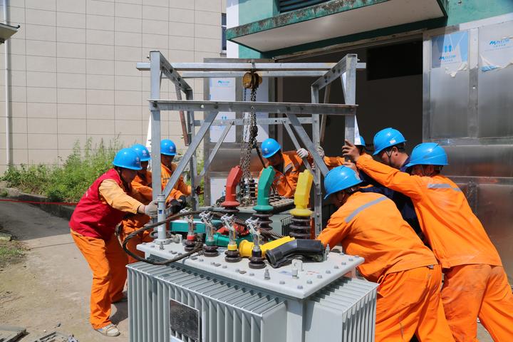 現場,施工人員8個人一組,把老舊的電纜拆除,將新的線徑更粗的電纜穿過地下孔洞,繞到配電室一側,再重新搭接線路。停電、驗電、吊離變壓器,安裝新變壓器……供電員工沒有片刻停頓,每個步驟有條不紊,迅速完成增容任務。